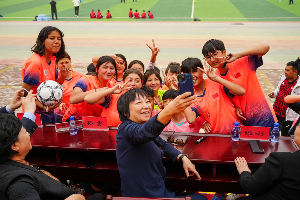 ↑4月12日,2025新疆克孜勒蘇柯爾克孜自治州足球聯(lián)賽開幕式后,中國足協(xié)副主席、前中國國家女子足球隊球員孫雯(前右一)與阿圖什市U13女子足球隊隊員阿依謝·托乎達洪(左三)交流。新華社記者 徐宏巖 攝