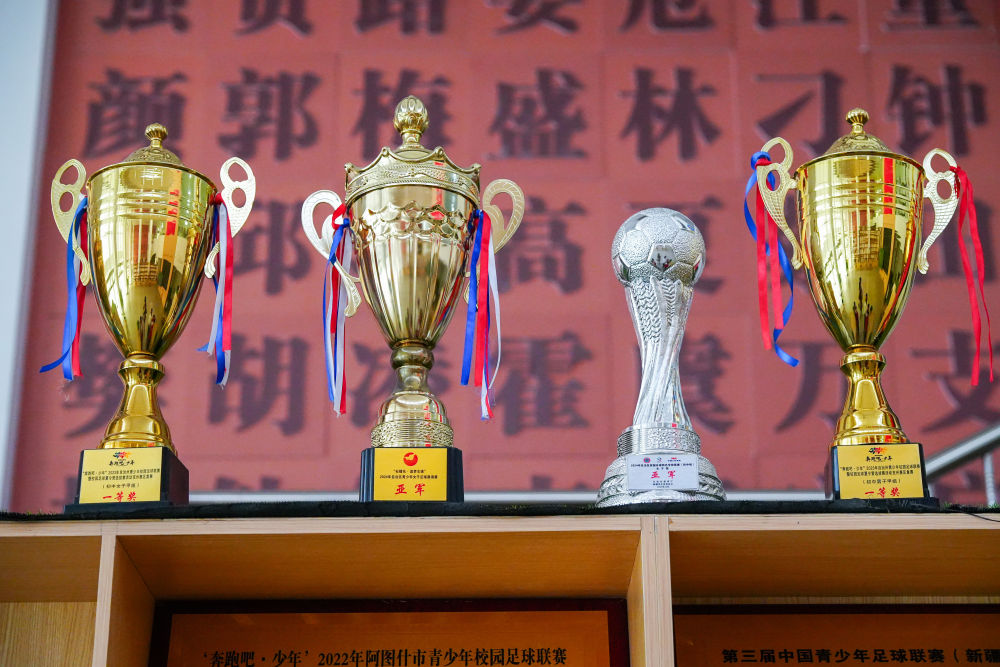 ↑這是4月14日在新疆克孜勒蘇柯爾克孜自治州阿圖什市硝魯克中學拍攝的獎杯。新華社記者 徐宏巖 攝