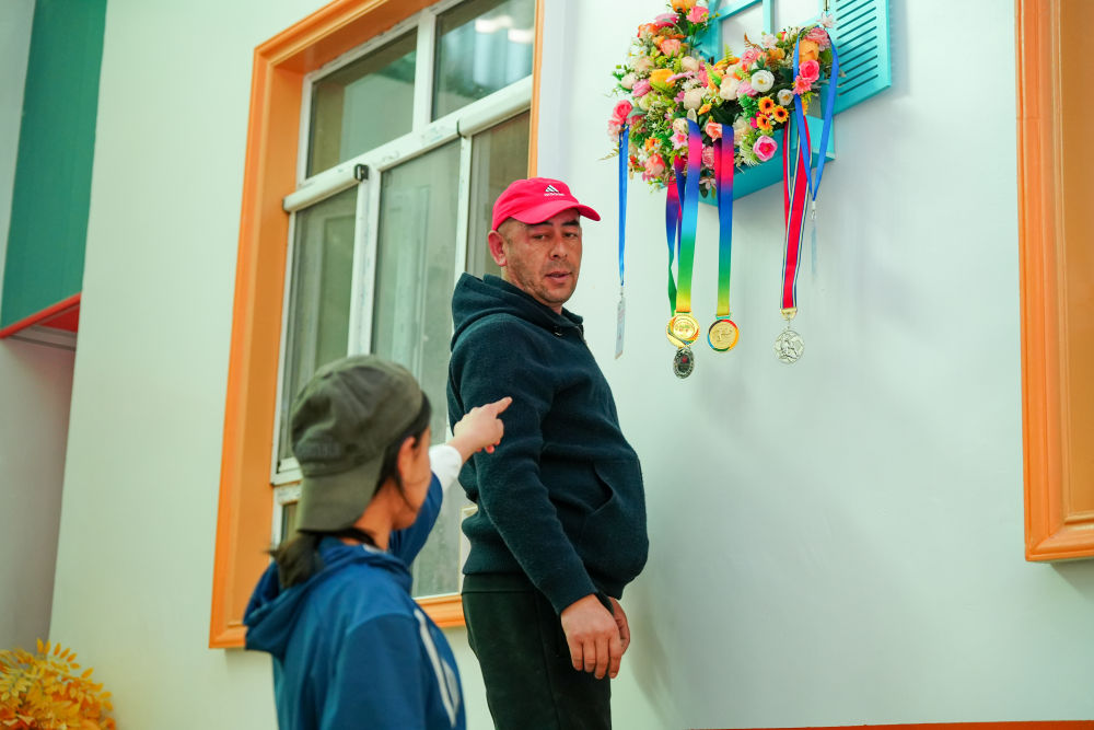 ↑4月13日,在阿圖什市亞喀巴格村,乃菲賽的父親幫女兒整理獎牌和參賽證件。新華社記者 徐宏巖 攝