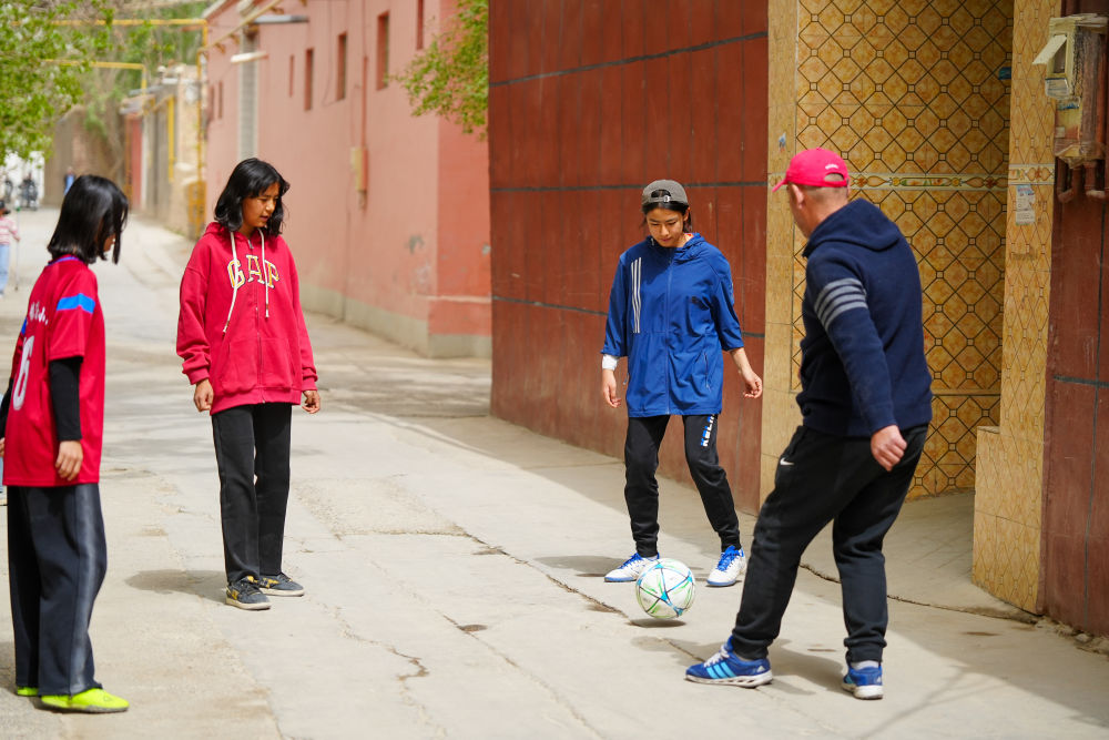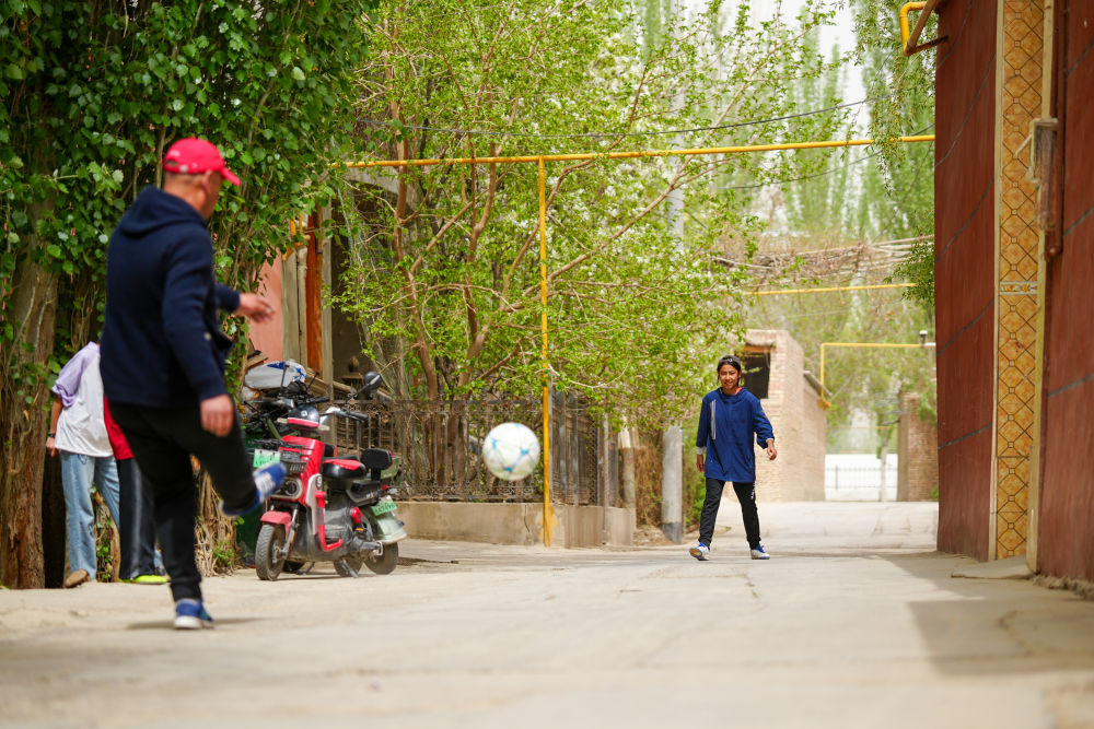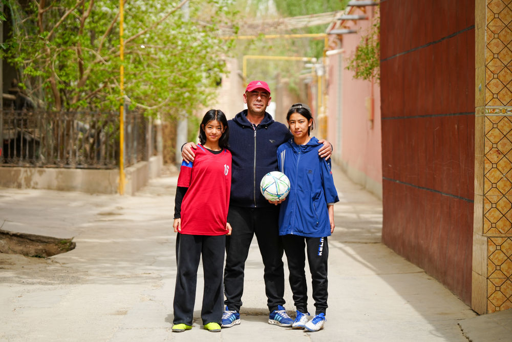 ↑4月13日,在阿圖什市亞喀巴格村,乃菲賽(右二)與父親、妹妹(左一)、艾妮再(左二)一起踢球。新華社記者 徐宏巖 攝