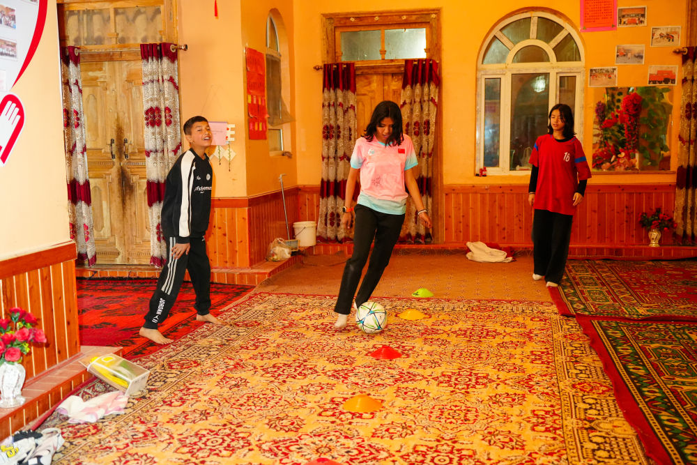 ↑4月13日,在阿圖什市亞喀巴格村,艾妮再(中)在家中與弟弟和朋友比拼帶球技術。新華社記者 徐宏巖 攝