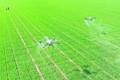 山東省青島市即墨區(qū)段泊嵐鎮(zhèn)瓦戈莊村綠色增糧先行示范區(qū),農(nóng)民采用植保無人機為小麥噴灑葉面肥。新華社發(fā)