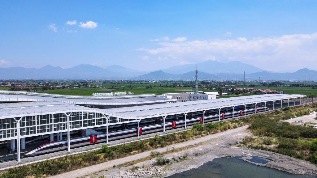 圖為2024年9月13日在印度尼西亞萬(wàn)隆德卡魯爾站拍攝的停靠在站臺(tái)上的雅萬(wàn)高鐵高速動(dòng)車(chē)組(無(wú)人機(jī)照片)。新華社記者徐欽攝