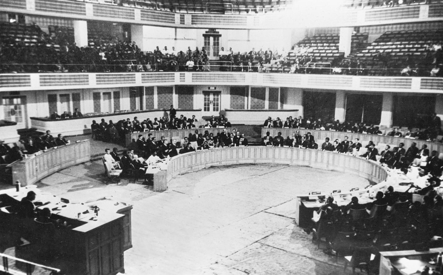 1955年4月18日至24日,29個(gè)亞非國(guó)家和地區(qū)的政府代表團(tuán)在印度尼西亞萬(wàn)隆召開(kāi)亞非會(huì)議。圖為萬(wàn)隆亞非會(huì)議會(huì)場(chǎng)內(nèi)景。新華社記者錢(qián)嗣杰攝