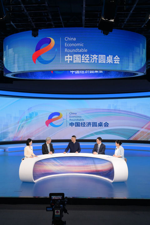 嘉賓們?cè)诘谑迤凇爸袊?guó)經(jīng)濟(jì)圓桌會(huì)”大型全媒體訪談節(jié)目錄制現(xiàn)場(chǎng)交流發(fā)言。新華社記者 李賀 攝