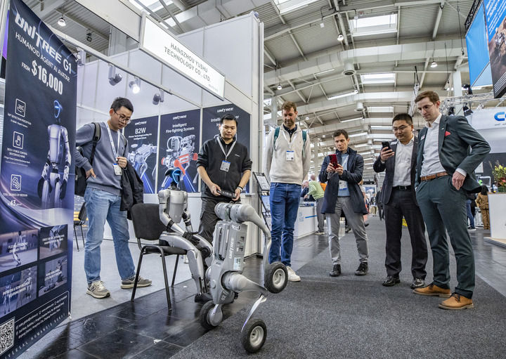2025年4月1日,在德國(guó)漢諾威工業(yè)博覽會(huì)上,人們?cè)谟顦淇萍颊箙^(qū)觀看機(jī)器狗演示。新華社記者 張帆 攝