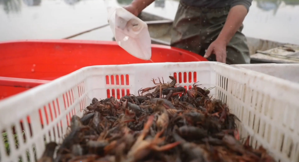剛出水的小龍蝦被立即送往分揀中心,進(jìn)行質(zhì)量檢驗(yàn)和稱重分級(jí)。分揀線上,分揀工岳臘春戴著橡膠手套,指尖翻飛間完成了龍蝦的分級(jí)。岳臘春說,“我們是發(fā)月工資,一個(gè)月5000元,一天工作按貨的多少來定?!?/p>