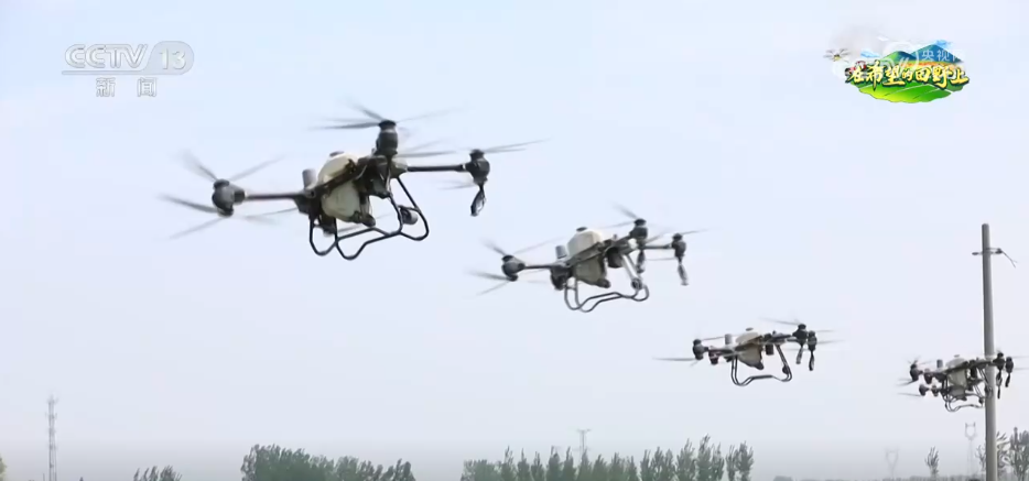 在濟(jì)寧市魚(yú)臺(tái)縣唐馬鎮(zhèn)楊宅子村的小麥種植地,6架植保無(wú)人機(jī)在飛手的熟練操作下,升空進(jìn)行“一噴三防”作業(yè)?!耙粐娙馈保侵竿ㄟ^(guò)植保無(wú)人機(jī)噴施葉面肥等混合劑,防治病蟲(chóng)害、預(yù)防干熱風(fēng)、防早衰,確保小麥增產(chǎn)豐收。