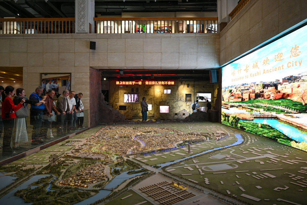 4月25日,來自埃及、伊朗、土耳其等國的外賓在喀什市老城區(qū)保護綜合治理紀念館參觀。新華社記者 辛悅衛(wèi) 攝