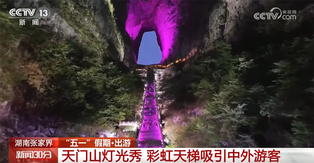“五一”假期,湖南天門山景區(qū)以自然風(fēng)光吸引中外游客。隨著夜幕降臨,天門山山體被五彩燈光點亮,999級彩虹臺階燈光流轉(zhuǎn),遠(yuǎn)看就像一道連通天地的彩虹橋,將千年奇觀天門洞裝點得更加巍峨壯觀。