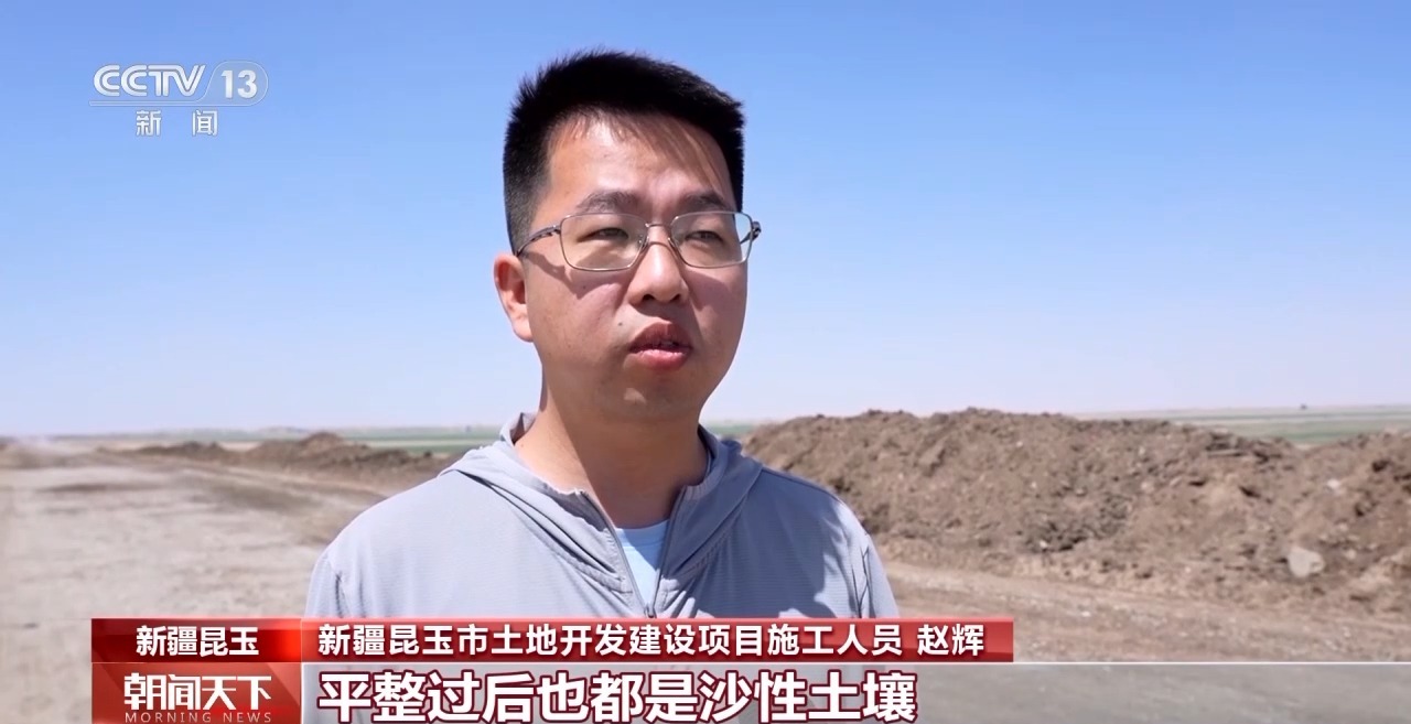 新疆昆玉市土地開(kāi)發(fā)建設(shè)項(xiàng)目施工員 趙輝:這邊原本都是沙漠原始地貌,平整過(guò)后也都是沙性土壤,沙土的營(yíng)養(yǎng)貧瘠,肥力差,抓一把土,能從指縫里漏掉90%。通過(guò)羊糞和水溶肥的有效結(jié)合,施進(jìn)去之后,我們能把沙土的結(jié)構(gòu)團(tuán)粒化,簡(jiǎn)單來(lái)說(shuō)就是把一團(tuán)散沙變成緊密有孔隙的小團(tuán)體,這樣施進(jìn)去的水和營(yíng)養(yǎng)都能留存住。