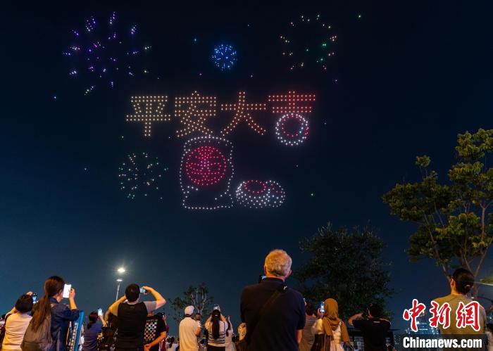 香港旅游發(fā)展局5月1日晚以天后誕、譚公誕及長(zhǎng)洲太平清醮三大傳統(tǒng)節(jié)慶為主題,在灣仔海濱舉辦無(wú)人機(jī)表演。香港特色民俗“搶包山”比賽場(chǎng)景在夜空出現(xiàn),“搶包山”搶上了天,引得圍觀人群贊嘆。
