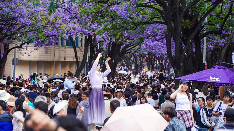 “五一”假期,前來昆明教場中路觀賞藍花楹的游客絡(luò)繹不絕(央廣網(wǎng)記者 魏文青 攝)