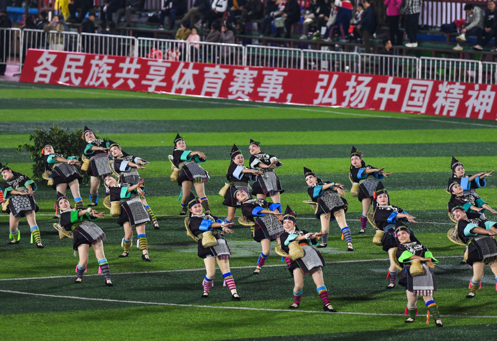 村民在貴州“村超”球場(chǎng)表演民族舞蹈(2025年3月14日攝)。新華社記者 楊文斌 攝