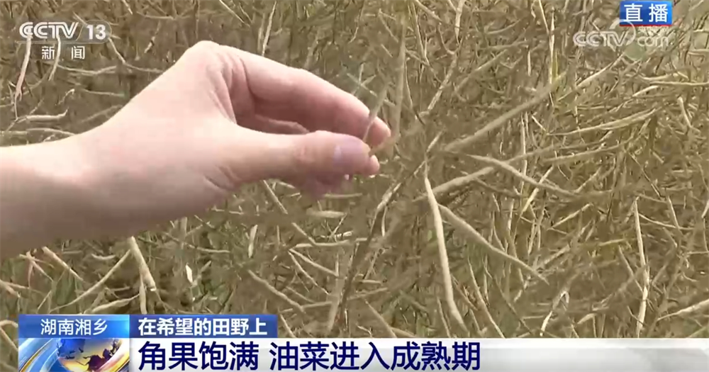 記者來(lái)到了湘潭湘鄉(xiāng)市泉塘鎮(zhèn)雙江村,油菜現(xiàn)在長(zhǎng)得怎么樣了?油菜的頂端已經(jīng)呈金黃色,角果很飽滿(mǎn),我們平時(shí)常說(shuō)的油菜籽就藏在金黃色的角果里,這說(shuō)明現(xiàn)在油菜已經(jīng)進(jìn)入成熟期了。