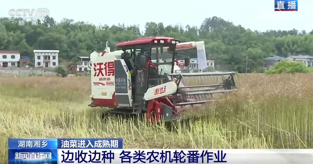 在一眼望不到頭的田里,各類(lèi)農(nóng)機(jī)正在火熱作業(yè)。首先,不少油菜籽已經(jīng)成熟了,不遠(yuǎn)處,專(zhuān)業(yè)的收割機(jī)正在迅速采收,確保顆粒歸倉(cāng)。種植戶(hù)介紹,今年得益于氣候和農(nóng)田改造,油菜籽的畝產(chǎn)有所增加。