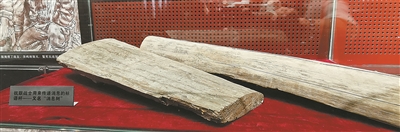 展柜中看似普通的兩塊木頭,實為文物“消息樹”。樹皮上,“中國報”等字跡仍能辨認。