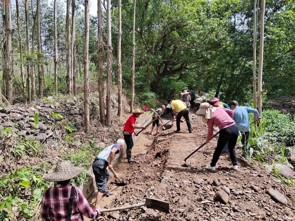 廣西武宣縣東鄉(xiāng)鎮(zhèn)屯應(yīng)村黨員干部與群眾一起修水渠抗旱。(雷正曉 攝)