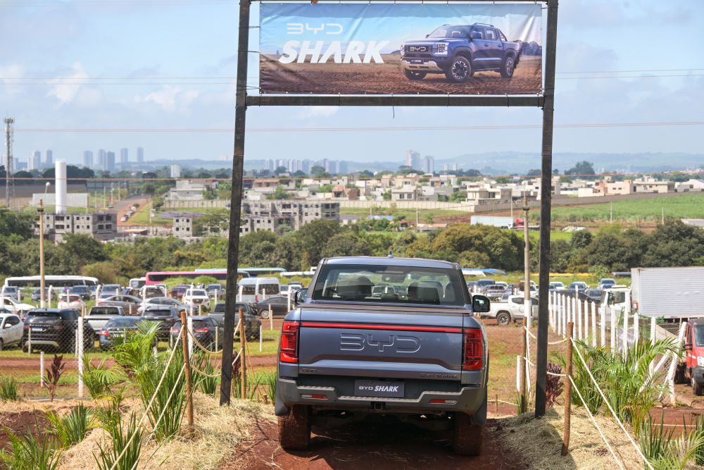 2025年4月29日,在巴西圣保羅州里貝朗普雷圖市舉行的2025年巴西農(nóng)業(yè)科技展上,一輛比亞迪皮卡進(jìn)行越野演示。新華社記者 陳昊佺 攝