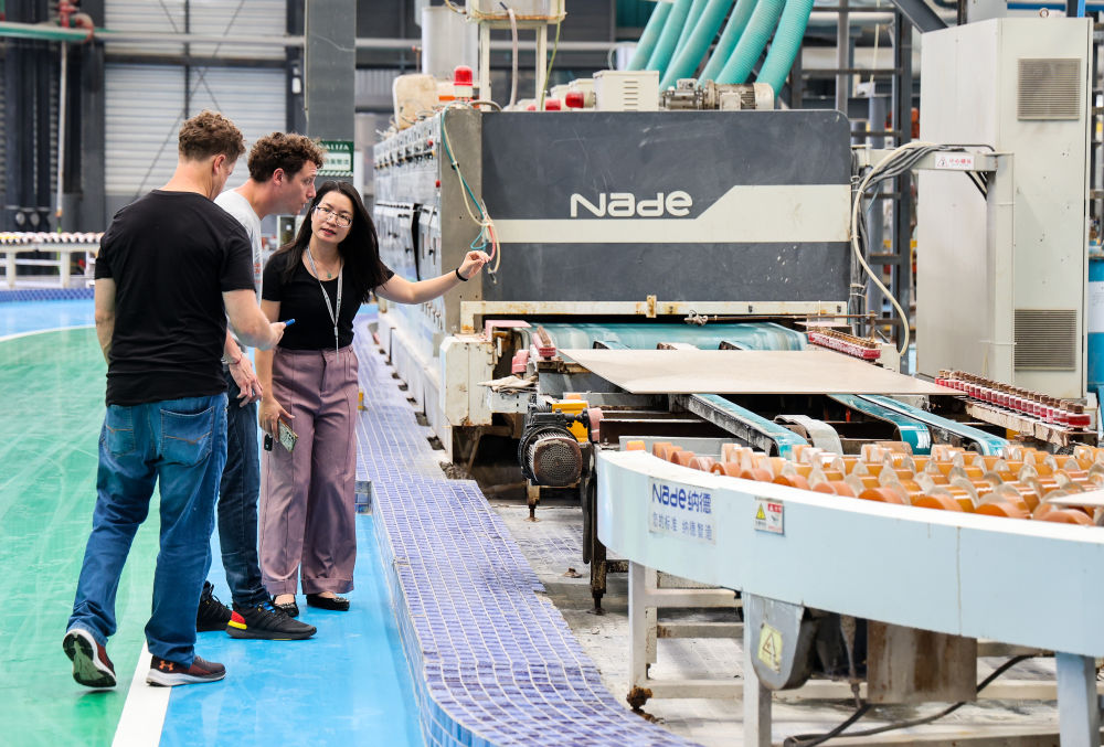 2025年4月22日,兩名參加廣交會(huì)的阿根廷采購商專程來到佛山參觀蒙娜麗莎大尺寸陶瓷巖板自動(dòng)生產(chǎn)線。新華社記者 劉大偉 攝