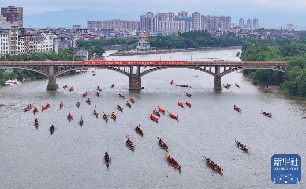 5月22日,龍船在湖南省永州市道縣縣城瀟水河面劃行備戰(zhàn)(無人機照片)。新華社發(fā)(何紅福攝)