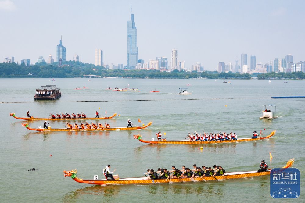 5月24日,龍舟隊伍在南京玄武湖上競逐(無人機照片)。新華社發(fā)(蘇陽攝)