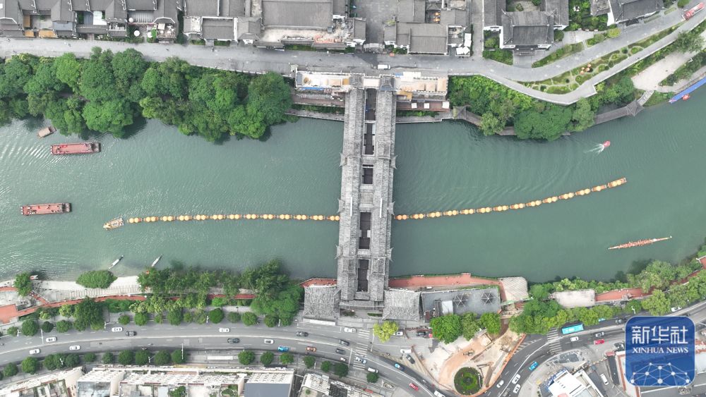 5月24日,在貴州省銅仁市碧江區(qū)錦江水域,觀光龍舟從風雨橋下穿過(無人機照片)。新華社發(fā)(申逸愷攝)