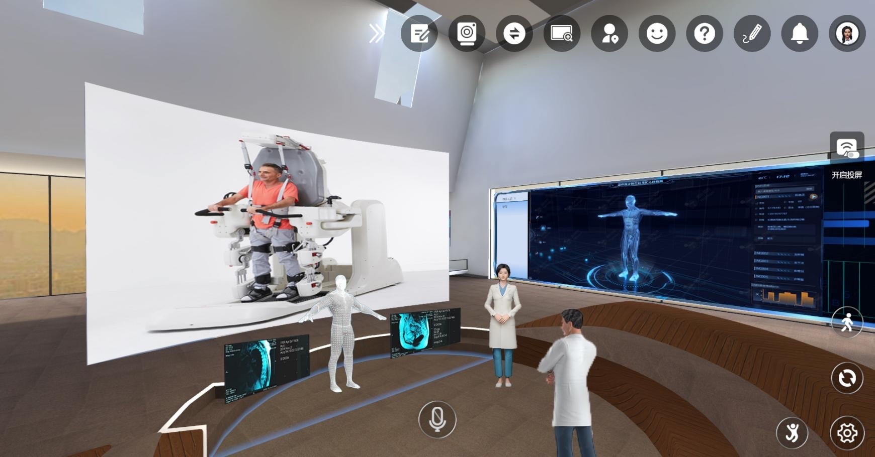 “就像推開一扇通往平行世界的門,這種‘在場(chǎng)感’是傳統(tǒng)遠(yuǎn)程協(xié)作難以企及的。”維賽客首席運(yùn)營(yíng)官徐晨翔邊演示邊解釋道。他調(diào)出了VS·work中的“智聯(lián)康復(fù)元診療平臺(tái)”——這是維賽客在醫(yī)療元宇宙領(lǐng)域的創(chuàng)新應(yīng)用,集成了病情診療、康復(fù)訓(xùn)練、社交培訓(xùn)等功能。在虛擬界面中,醫(yī)生可以通過高精度空間定位系統(tǒng)“走進(jìn)”患者的虛擬診療室,患者則通過可穿戴設(shè)備完成肌力評(píng)估、平衡訓(xùn)練等動(dòng)作,數(shù)據(jù)實(shí)時(shí)反饋至醫(yī)生終端,為偏遠(yuǎn)地區(qū)的患者提供了更加便捷、高效的診療服務(wù)。