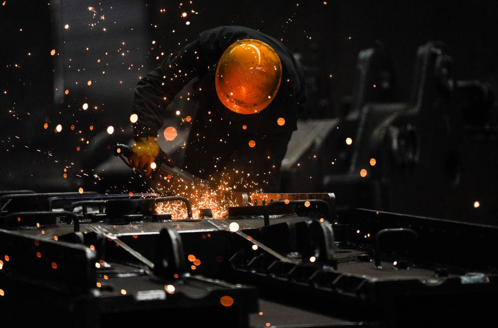 3月19日,工人在林州重機集團股份有限公司的鉚焊車間進行打磨作業(yè)。