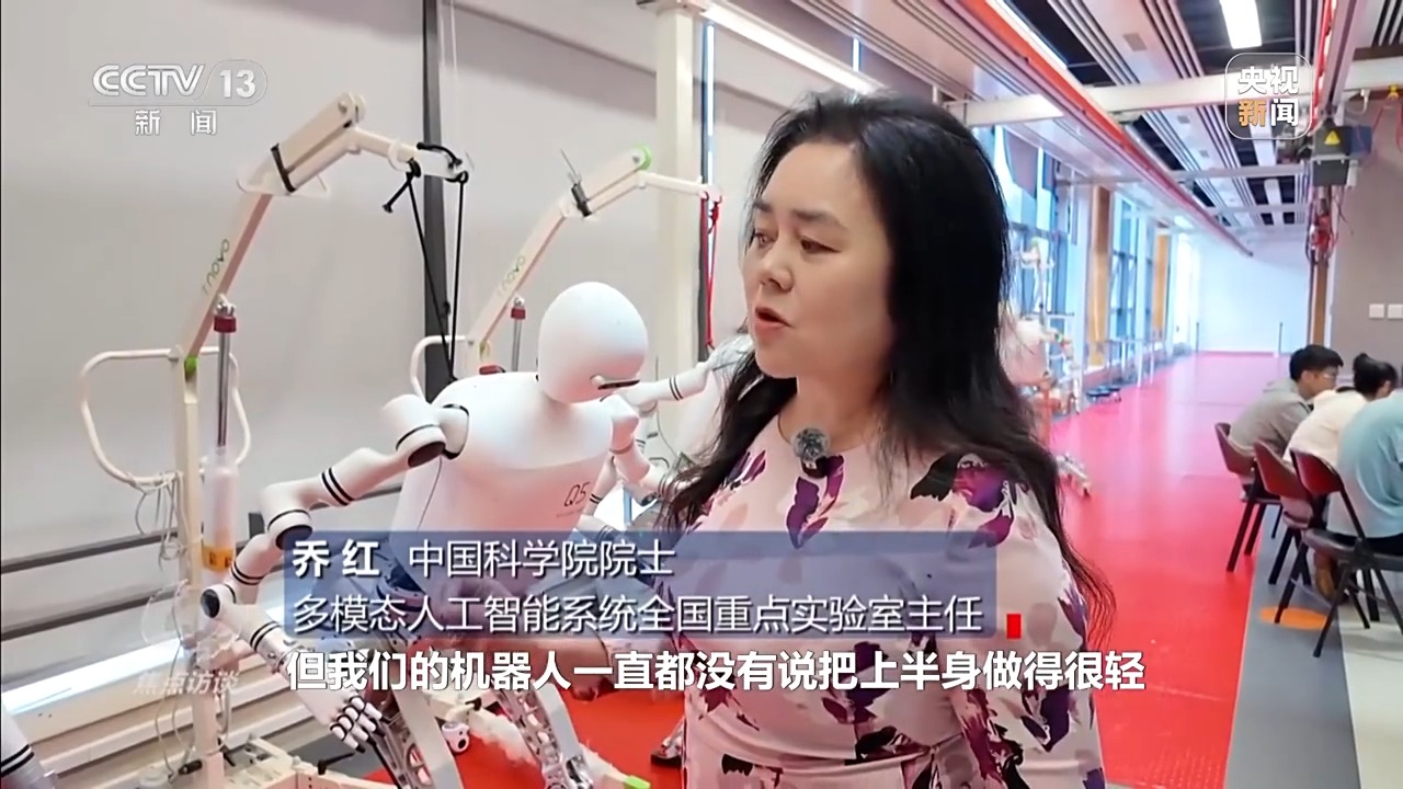 中國科學院院士、多模態(tài)人工智能系統(tǒng)全國重點實驗室主任 喬紅:人形機器人都是自由度(關節(jié))比較多,但我們的機器人一直都沒有把上半身做得很輕,因為它是要作業(yè)的、干活的,所以沒有專門追逐要跑得快,跑得快也是我們的期望,現(xiàn)在也能跑2.2米每秒。