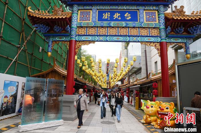 下午3點(diǎn)多,臺(tái)北街上已聚集不少食客,大腸包小腸、咸酥雞、旗魚黑輪、愛玉冰等美食琳瑯滿目。放眼望去,融合滇西古建筑特色的牌坊、源于閩南古厝的攤車商亭、來(lái)自臺(tái)中黃永阜老人的眷村彩繪,讓兩岸同根同源的文脈在此交匯。