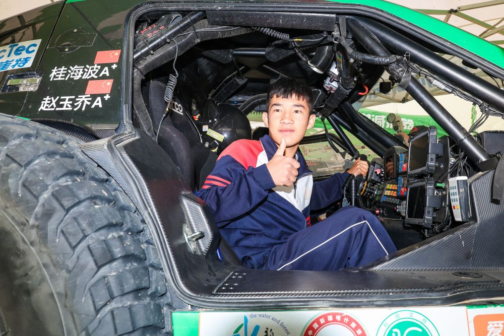 2025年5月31日,新疆喀什地區(qū)麥蓋提縣的中學(xué)生在環(huán)塔營(yíng)地參觀(guān)時(shí)與賽車(chē)合影。新華社發(fā)(環(huán)塔組委會(huì)供圖)