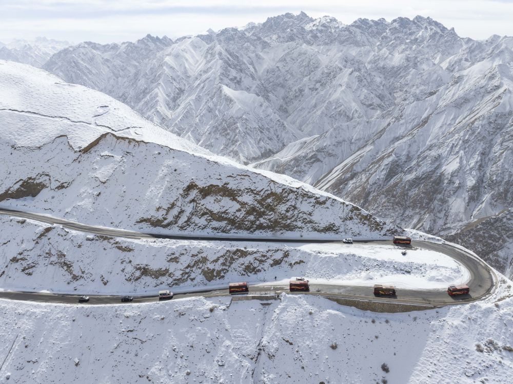 在新疆塔什庫(kù)爾干塔吉克自治縣,參加“盤(pán)龍古道”恢復(fù)通車(chē)儀式的車(chē)隊(duì)在行進(jìn)中(2025年3月22日攝)。新華社記者 徐宏巖 攝