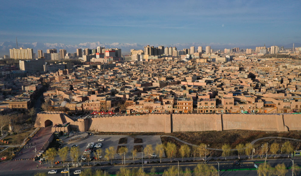 清晨,灑滿(mǎn)陽(yáng)光的喀什古城(2023年3月10日,無(wú)人機(jī)拍攝)。新華社記者 李響 攝