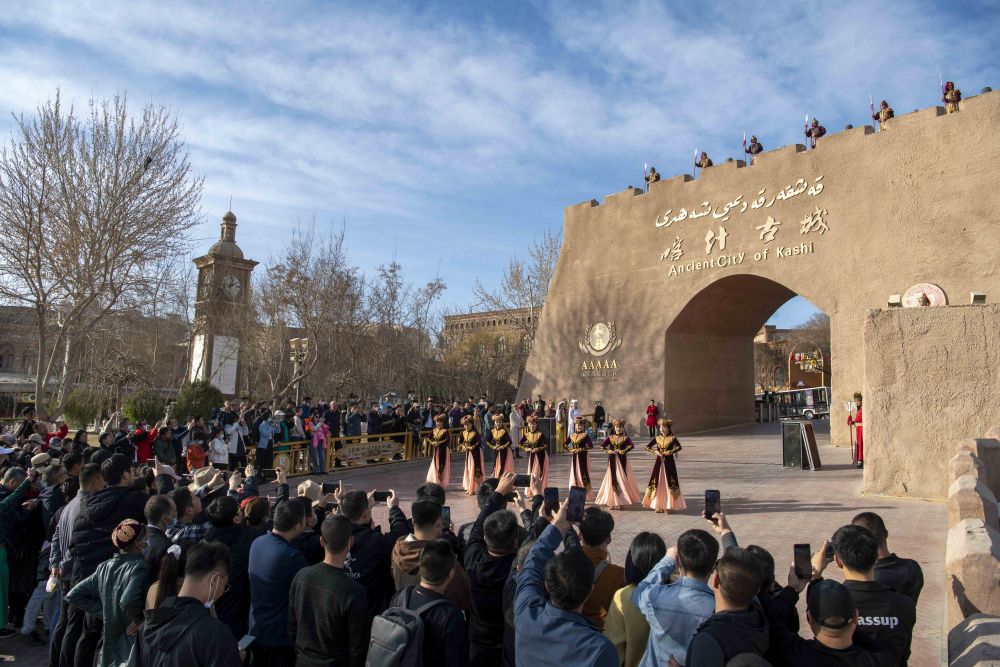 游客在新疆喀什古城景區(qū)東大門(mén)觀(guān)看“開(kāi)城儀式”(2023年3月10日攝)。新華社記者 胡虎虎 攝