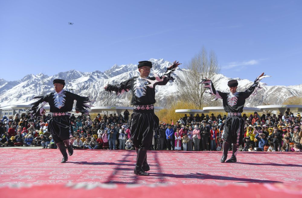 在新疆塔什庫(kù)爾干塔吉克自治縣“彩云人家”民俗村,演員為觀(guān)眾表演國(guó)家級(jí)非物質(zhì)文化遺產(chǎn)——鷹舞(2025年3月22日攝)。新華社記者 胡虎虎 攝