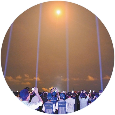 “5,4,3,2,1”——火箭的火焰照亮夜幕,平臺的光束射向天際……19時50分,火箭發(fā)射升空,游客們舉著手機記錄,現場歡呼聲陣陣?!昂芘d奮、很震撼,感覺一伸手就能‘抓’到火箭?!毖逾暦普f。