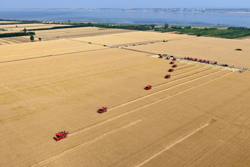 6月2日,農(nóng)機(jī)手駕駛聯(lián)合收割機(jī)在山東省滕州市南沙河鎮(zhèn)河匯村麥田里收割小麥(無(wú)人機(jī)照片)。