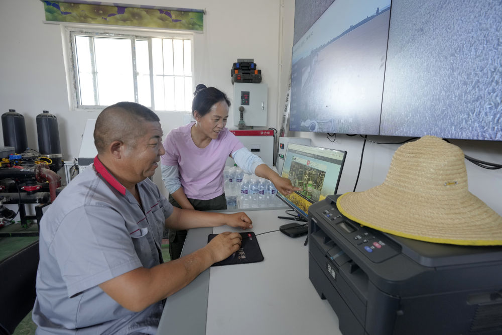 在山西省運(yùn)城市鹽湖區(qū)解州鎮(zhèn)曲村,董會(huì)龍(左)和妻子范月親通過(guò)農(nóng)機(jī)精準(zhǔn)作業(yè)平臺(tái)查看農(nóng)機(jī)手作業(yè)情況。董會(huì)龍夫妻是運(yùn)城市鹽湖區(qū)解州鎮(zhèn)的種糧大戶。(5月27日攝)。