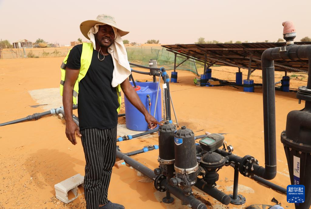 5月22日,在毛里塔尼亞西部特拉扎區(qū)比爾·巴爾卡村,中非綠色技術(shù)公園園區(qū)灌溉技術(shù)工人穆罕默德·伊塞勒穆介紹園區(qū)智能灌溉設(shè)備。新華社記者 司源 攝