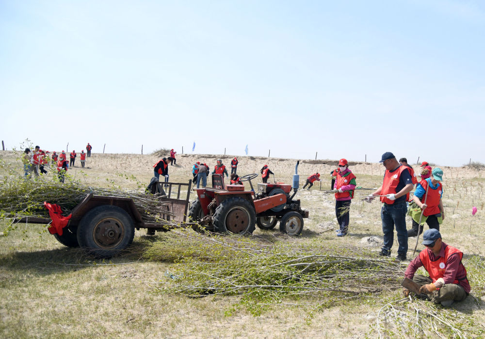 人們?cè)诘靥帨喩七_(dá)克沙地的正藍(lán)旗寶紹岱蘇木開展植綠活動(dòng)。新華社 發(fā)