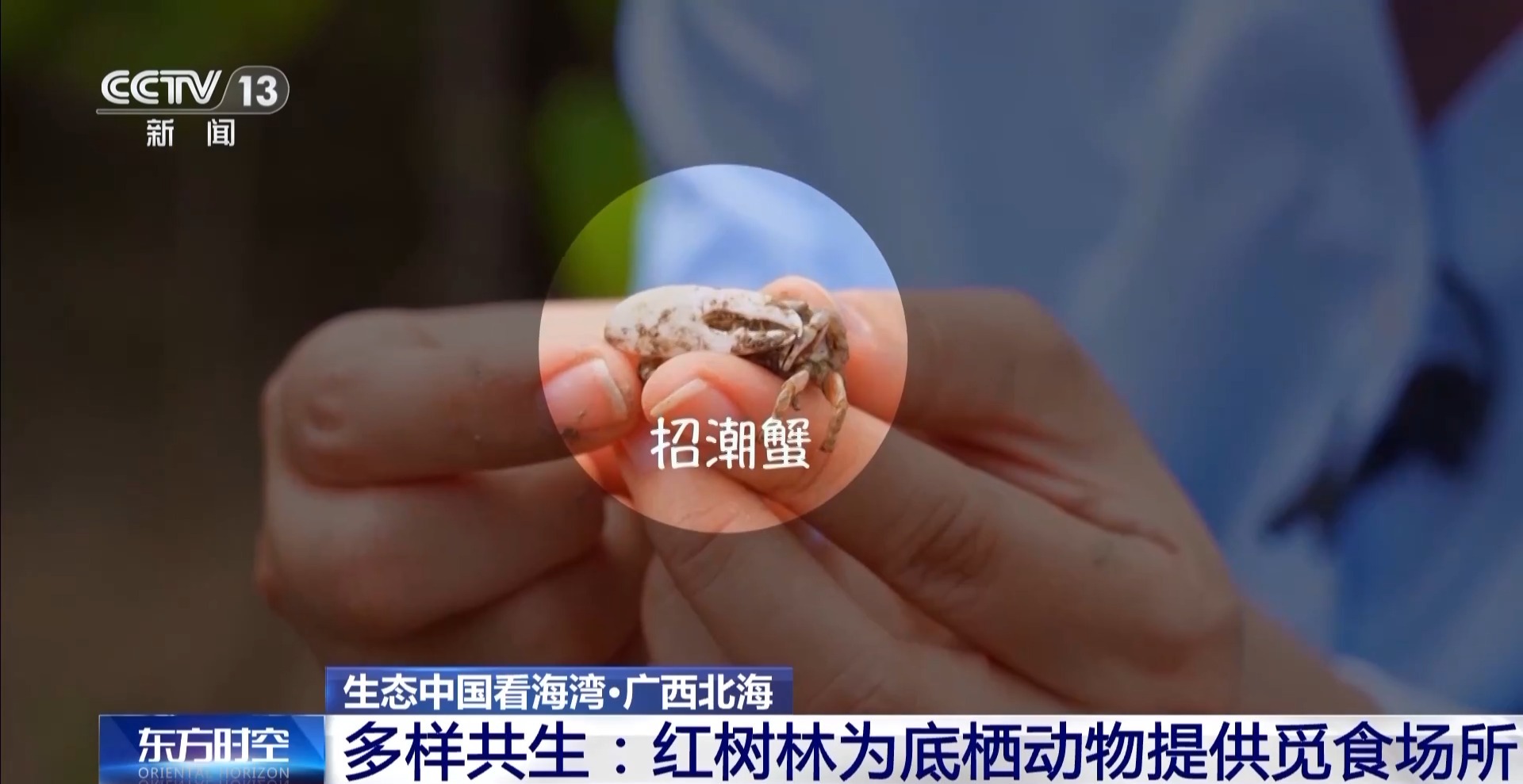 總臺記者 王潔:我手上就有兩只非??蓯鄣男奉?,非常小巧玲瓏,很可愛活潑,叫擬相手蟹,喜歡爬樹?;野咨氖谴菩罚坌穭t是個更大而且全身通紅,更加威風凜凜,它們叫“招潮蟹”。