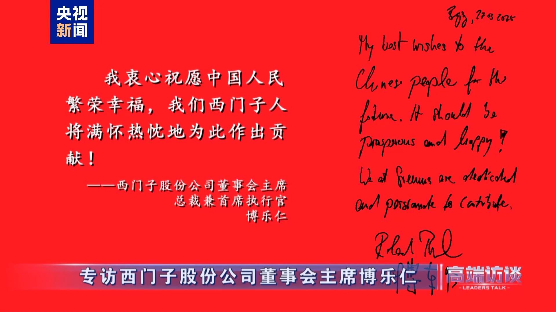 西門(mén)子股份公司董事會(huì)主席總裁兼首席執(zhí)行官博樂(lè)仁在接受總臺(tái)專(zhuān)訪后題詞