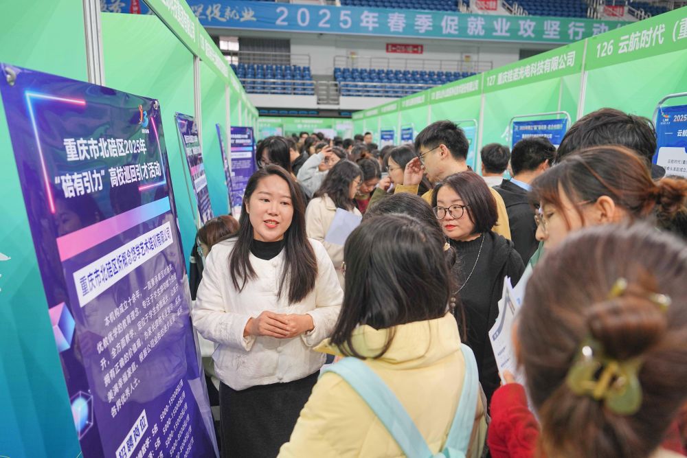 3月28日,西南大學應屆畢業(yè)生在2025年春季促就業(yè)攻堅行動綜合類雙選會現(xiàn)場了解崗位信息。活動邀請裝備制造、新能源、數(shù)字信息、綠色化工、基礎教育、醫(yī)療衛(wèi)生等行業(yè)領域企業(yè)參與,為畢業(yè)生搭建廣闊多元的就業(yè)平臺。新華社發(fā)(秦廷富攝)