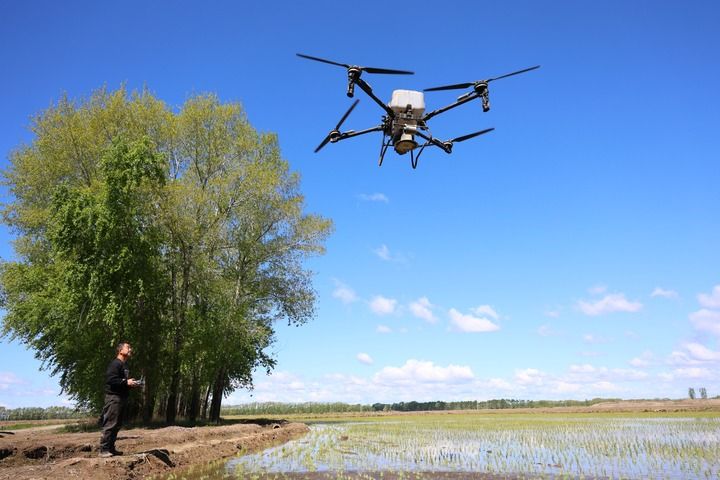 2025年5月21日,在北大荒集團黑龍江綏濱農(nóng)場有限公司東井管理區(qū),操作員操控搭載北斗導航系統(tǒng)的植保無人機,對即將施返青肥的地塊進行打點。新華社發(fā)(李興攝)