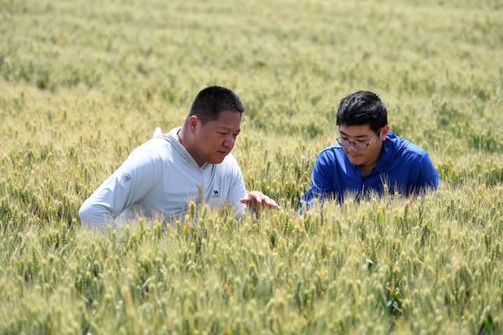 賈俊杰(左)和農(nóng)業(yè)技術(shù)員在山西運城永濟市虞鄉(xiāng)鎮(zhèn)麥田里查看小麥生長情況(2025年5月21日攝)。新華社發(fā)(薛俊攝)