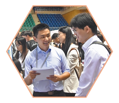 中國人民大學經(jīng)管專場雙選會現(xiàn)場,合作企業(yè)工作人員(左)與求職同學交流。 中國人民大學供圖