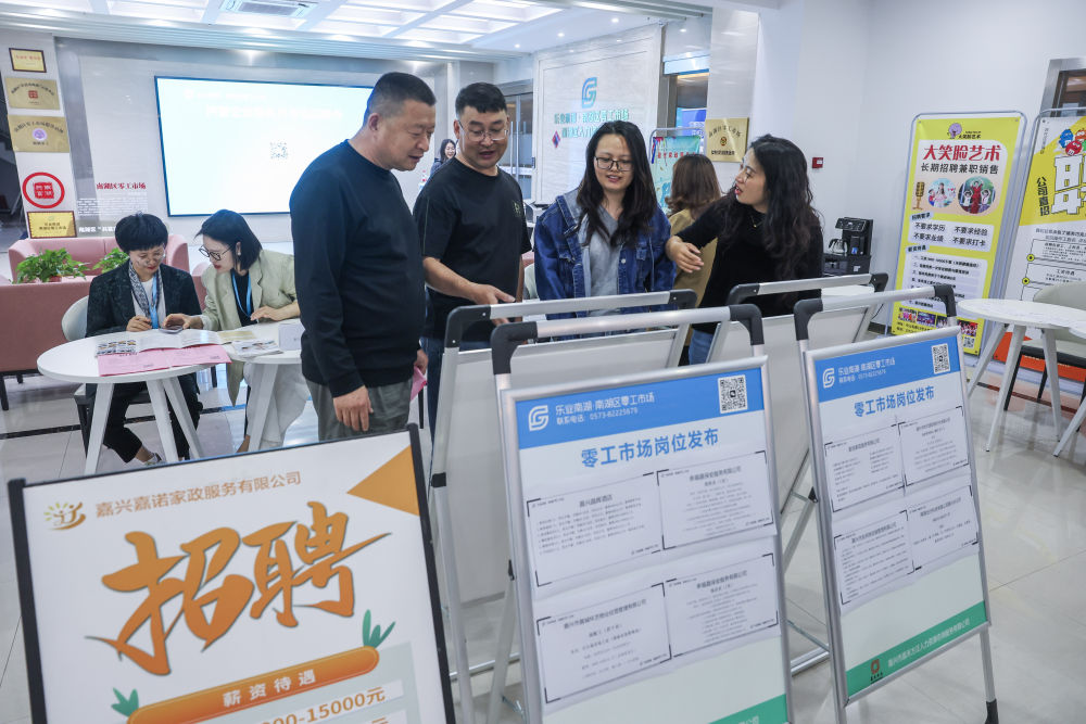 5月8日,在浙江省嘉興市南湖區(qū)零工市場的一場零工招聘會(huì)上,求職者查看各類崗位。新華社記者 徐昱 攝