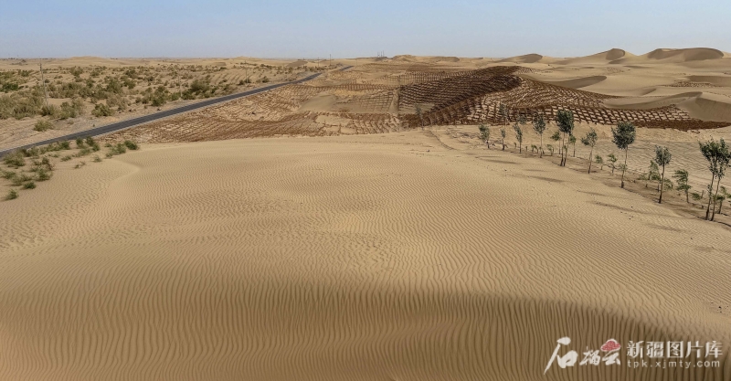 6月13日,在且末縣防風治沙基地,一株株紅柳、梭梭及草方格守護著沙海。