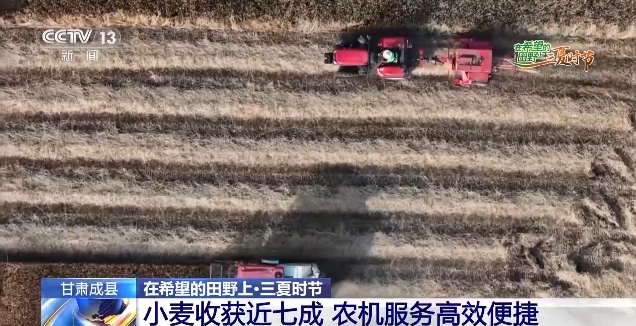 甘肅省隴南市成縣蘇元鎮(zhèn)水壩村的全國綠色食品原料標(biāo)準(zhǔn)化生產(chǎn)基地內(nèi),1600畝小麥近日進(jìn)入收獲高峰。農(nóng)戶自清晨6時起搶收小麥。該區(qū)域一片約20畝的麥田,過去需20人勞作5天完成收割、脫粒至晾曬全過程;如今1臺機(jī)械作業(yè)3小時即可完成收割與脫粒,效率顯著提升。